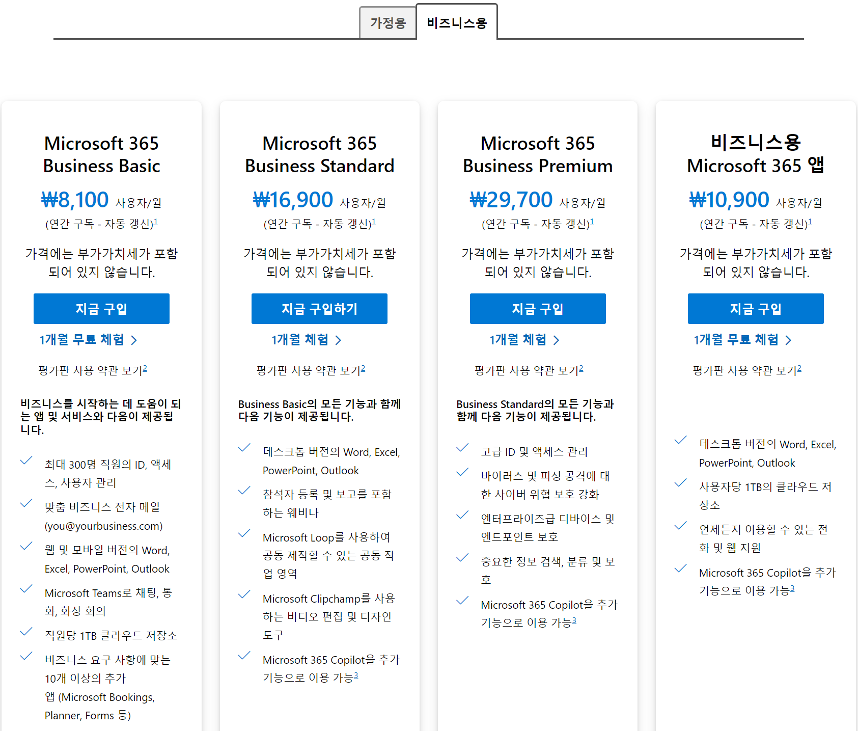 | OneDrive 저장소 | 1TB OneDrive for Business (비즈니스용 클라우드 저장소) | 1TB OneDrive Personal (개인용 클라우드 저장소) |